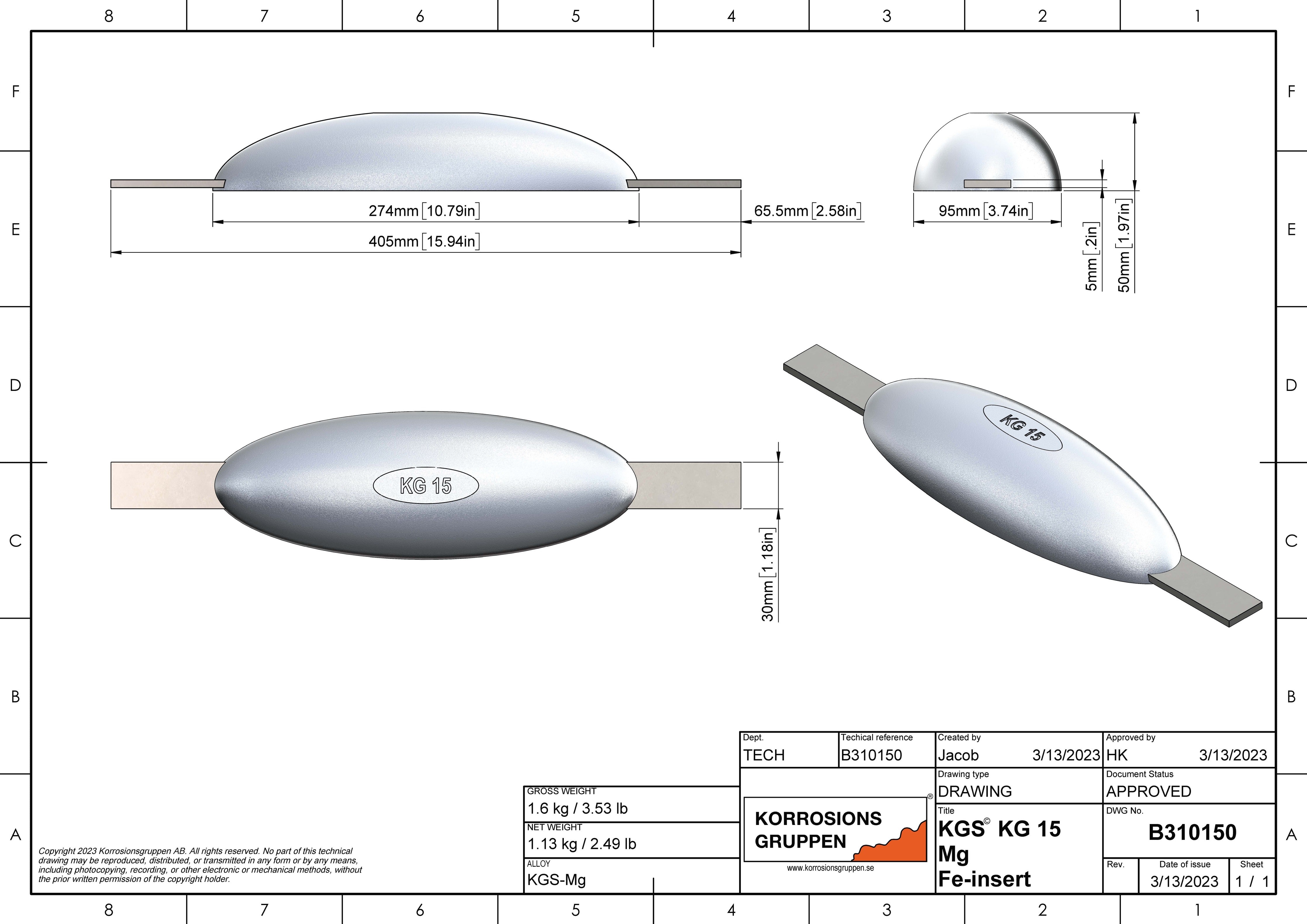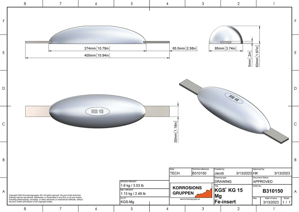 Magnesium anode type 15 - 10.78 * 3.74 * 1.96, (15.94inch), Ca3.3Lb. AZ63-1.5VDC.